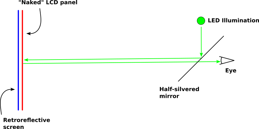 Assuming that the distance from the eye to the screen is large enough, it's possible that the light angles are approximately the same if we do away with the half-silvered mirror and instead use LED illumination that is coming from close to the eye position. This would simplify the system, remove glass from in front of the eye, and make the image brighter.
